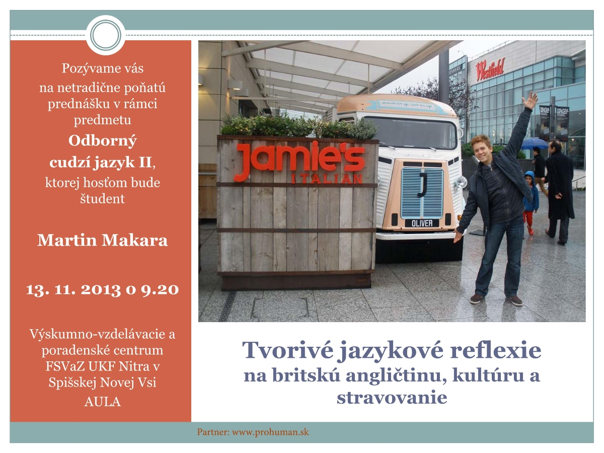 V rámci pedagogického projektu „Mladí mladým – tvorivé reflexie“, realizovanom na pôde Výskumno-vzdelávacieho a poradenského centra v Spišskej Novej Vsi FSVaZ Univerzity Konštantína Filozofa Nitra, sa dňa 3. decembra 2013 uskutočnila druhá aktivita pilotnej série projektu, ktorá má názov „Tvorivé jazykové reflexie na britskú angličtinu, kultúru a stravovanie“. Účastník projektu, 16-ročný stredoškolák Martin Makara zo Spišskej Novej Vsi varil študentom odboru Sociálna práca vlastné kulinárske špeciality. Inšpiráciu čerpá vo svojom kuchárskom vzore, ktorým je britský šéfkuchár Jamie Oliver.